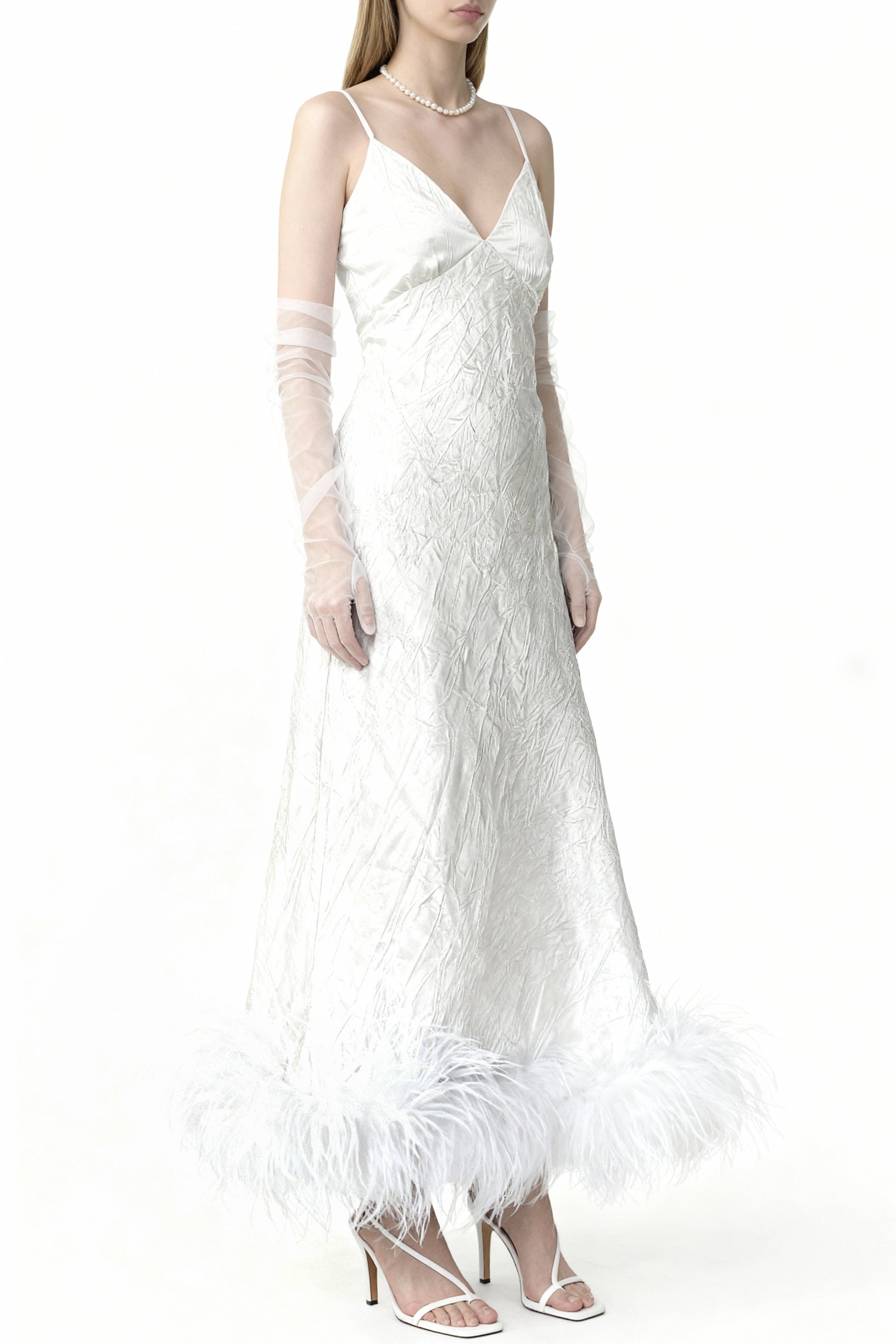 Slip dress inspired by the contrast between textured satin and the soft outline of feather trim
