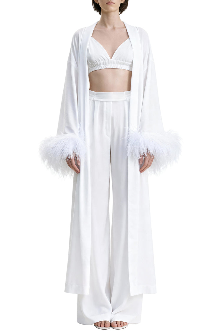 This three-piece lyocell-linen ensemble includes a kimono, matching bralette, and wide-leg pants.