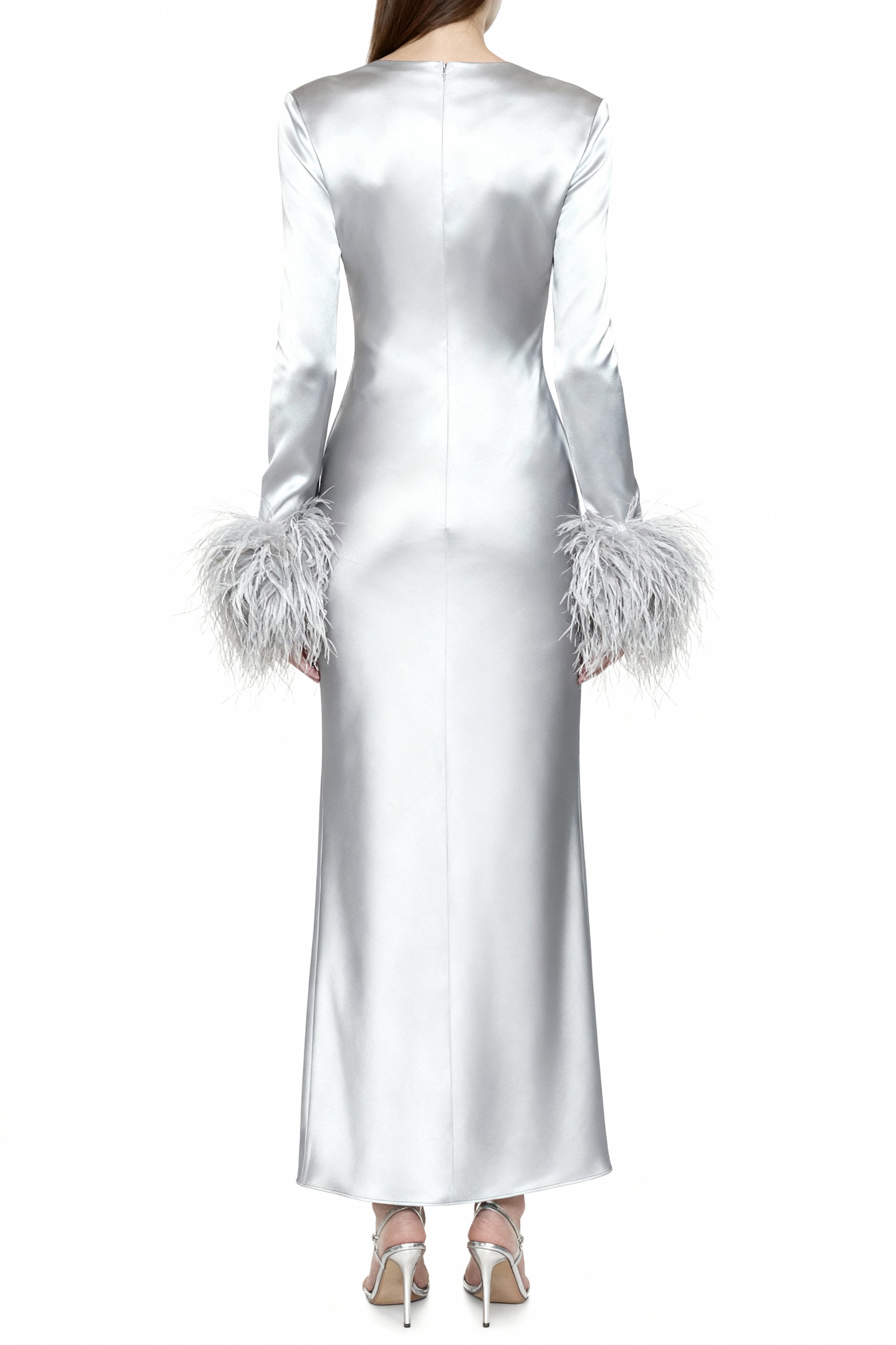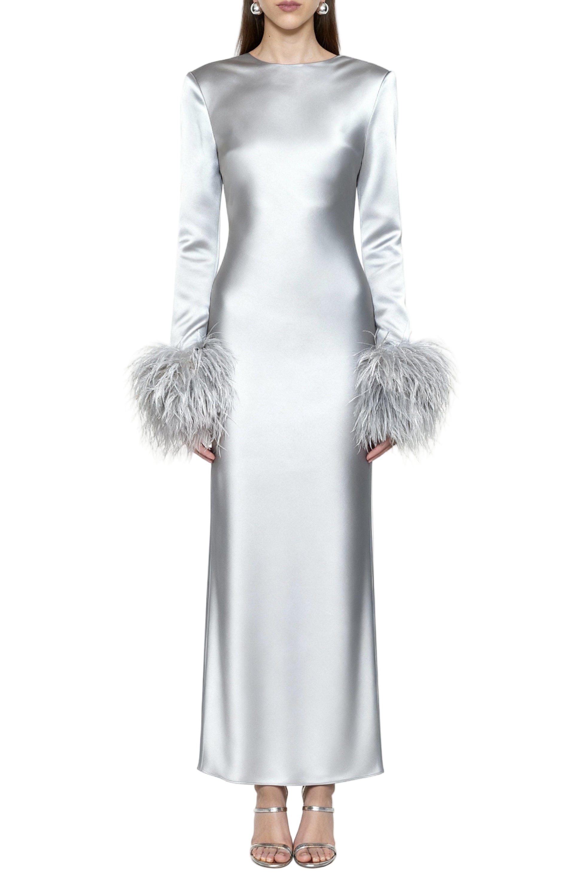 A long-sleeve bias-cut dress with a clean column silhouette.